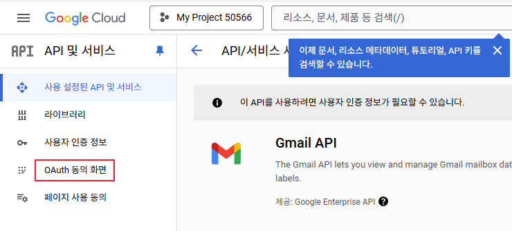 - Gmail API를 활성화 했던 화면에서 왼쪽 탐색 메뉴의 "OAuth 동의 화면"을 클릭한다.