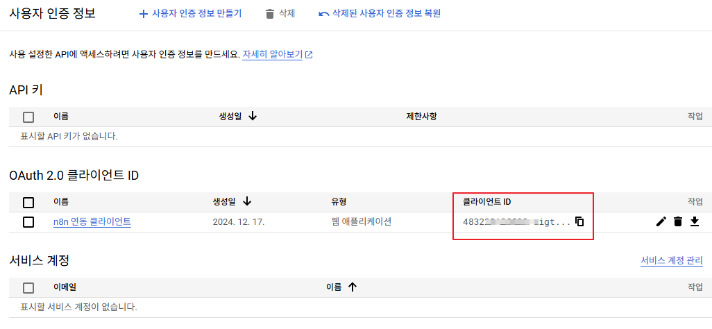 - 생성된 OAuth 2.0 클라이언트 ID 항목에서 "클라이언트 ID"를 카피 해 둔다.