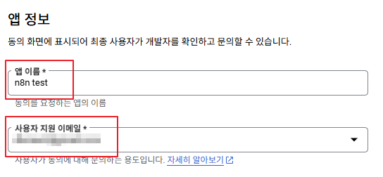 - 앱 등록 수정 화면에서 앱 정보(앱 이름, 사용자 지원 이메일)를 작성한다.