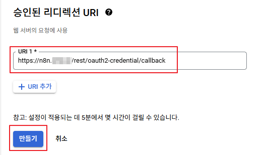 - 승인된 리디렉션 URI 항목에서 "+ URI 추가" 버튼을 클릭해서 n8n에서 카피한 OAuth Redirect URL을 입력합니다. 리디렉션 URI 확인 방법은 "2. n8n 자격 증명 설정" 챕터의 c 단계에서 확인 할 수 있다. 그리고 나서 "만들기" 버튼을 클릭한다.