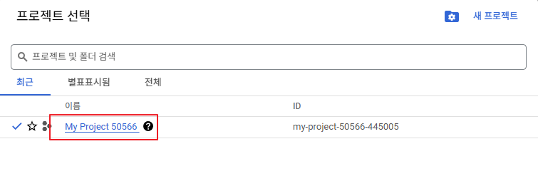 - 콘솔 화면 왼쪽 상단 "프로젝트 선택" 버튼을 클릭해서 방금 만든 프로젝트를 클릭한다.