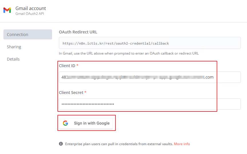 . - 전 단계에서 카피 해둔 클라이언트 ID와 클라이언트 보안 비밀번호를 입력하고 "Sign in with Google" 버튼을 클릭한다.