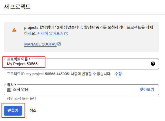 (2) 구글 클라우드 콘솔 프로젝트 생성
