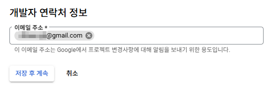 - 개발자 연락처 정보에 이메일 주소를 입력하고 "저장 후 계속" 버튼을 클릭한다.