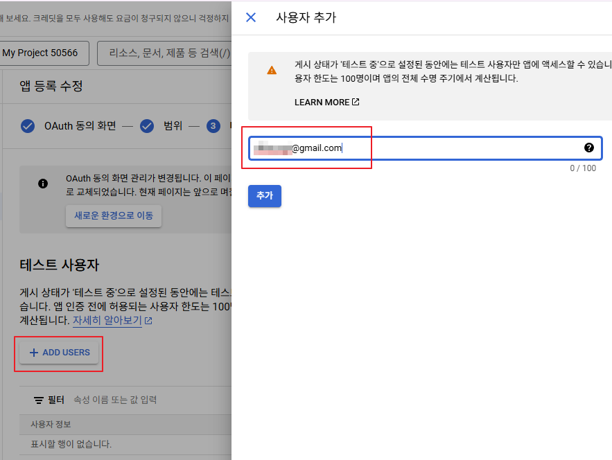 - 외부(External) 사용자 유형인 경우, 테스트 사용자 등록이 필수이다. 테스트 사용자 단계에서 "+ ADD USERS" 버튼을 클릭해서 테스트 사용자를 등록한다. 그리고 나서 "저장 후 계속" 버튼을 클릭한다.