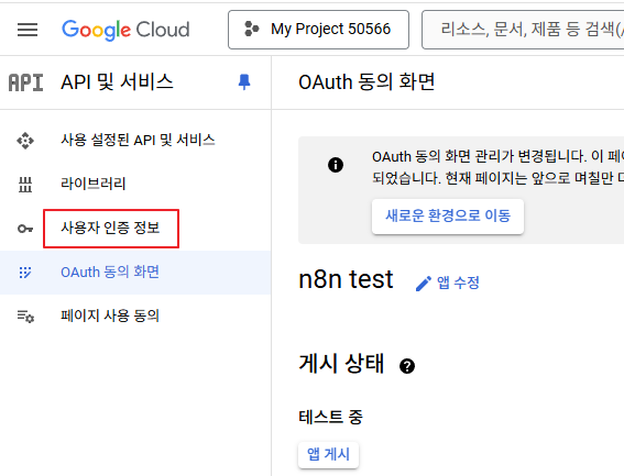 - Gmail API를 활성화 했던 화면에서 왼쪽 탐색 메뉴의 "OAuth 동의 화면"을 클릭한다.