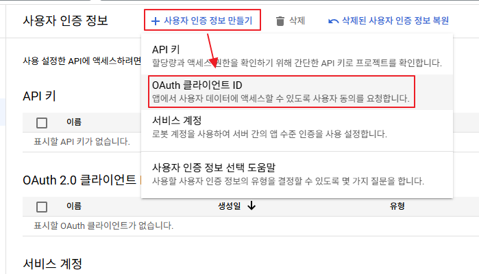 . - 사용자 인증 정보 화면에서 "+ 사용자 인증 정보 만들기" 메뉴를 클릭하고 "OAuth 클라이언트 ID"를 선택한다.
