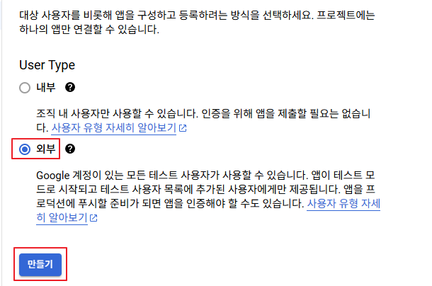 - "OAuth 동의 화면"의 User Type을 "외부"를 선택한다. Google Workspace 사용자가 아닐 경우 앱을 외부(일반) 사용자에게 제공하는 것만 가능하다. 그리고 "만들기" 버튼을 클릭한다.