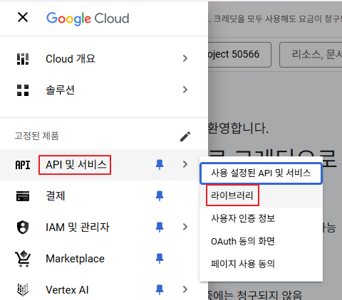 - 탐색 메뉴에서 "API 및 서비스" > "라이브러리"로 이동한다.