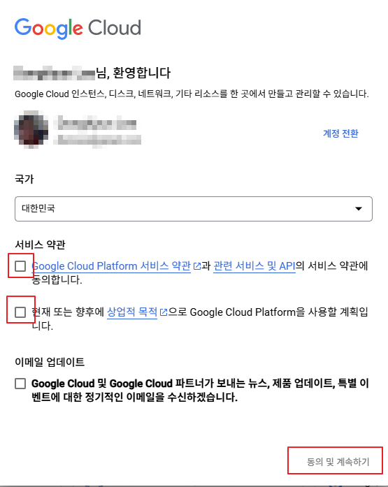 - 팝업의 서비스 약관 2개 항목을 체크 표시하고 "동의 및 계속하기"를 클릭한다.