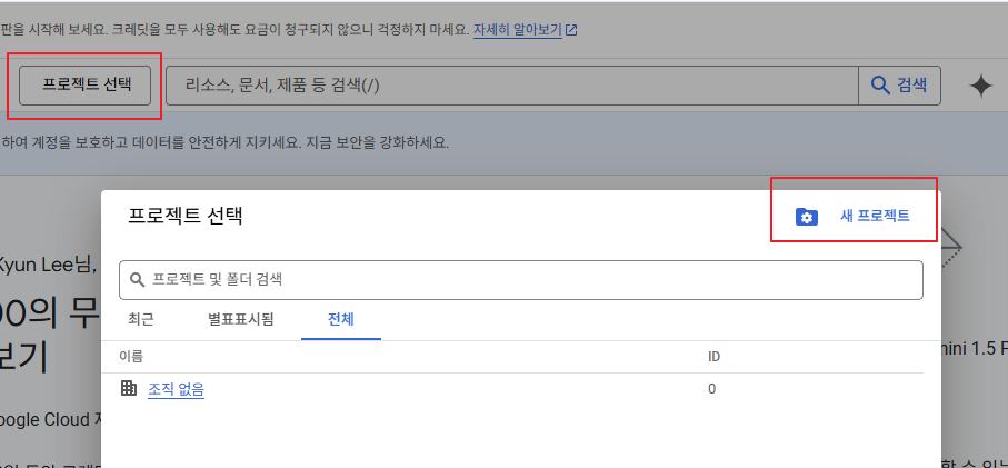- 콘솔 화면에서 왼쪽 상단 "프로젝트 선택" 버튼을 클릭하고 프로젝트 선택 팝업에서 "새 프로젝트"를 클릭한다.